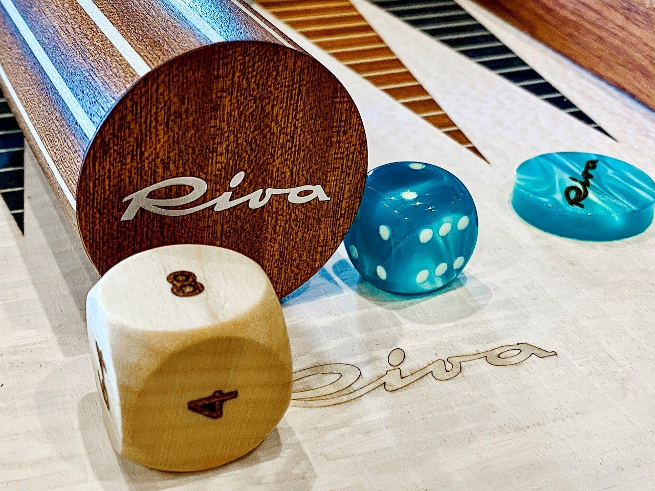 The Riva Backgammon set isn’t just a game but a genuine work of art available in two versions: one with an exterior covering in aquamarine mambo fabric and the other in blue leather. In both cases, the mahogany and maple construction is a jewel of craftsmanship, with a steel Riva logo either inlaid or, in the more luxurious leather model, with a “transparency” effect.