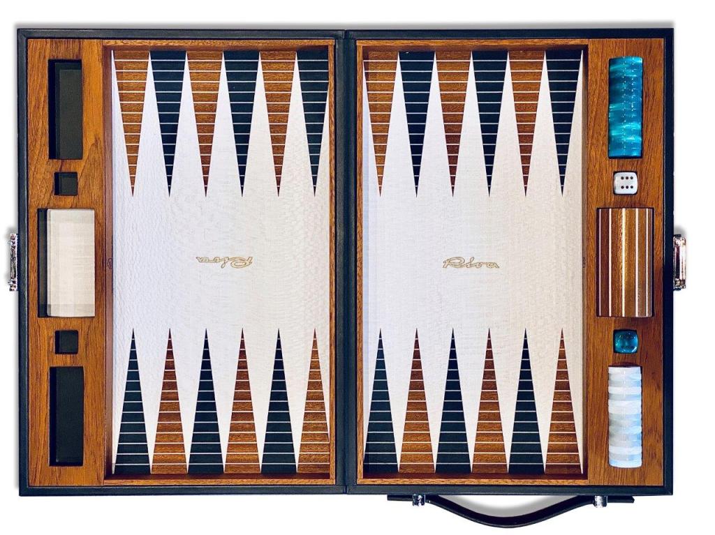 The white and aquamarine dice and pieces have mahogany inlays and show the same passion for detail that makes the world’s most coveted yachts so inimitable.
