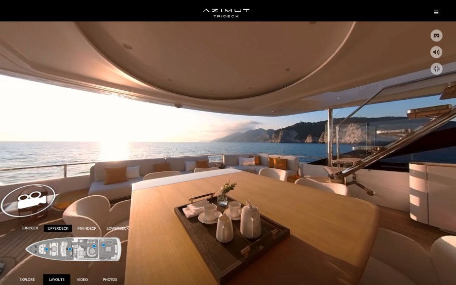 The launch of the new flagship also gave Azimut Yachts the chance to bring forward the introduction of A-LIVE, a cutting-edge multi-sensory immersive digital experience that makes use of 360-degree vision to allow online users to move around the yacht and, above all, to convey the sense of openness and contact with the water.