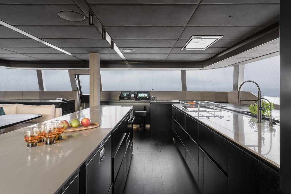 The yacht’s main deck saloon features a lounging space with a large sofa, a wine cooler and a cozy elevated reading spot. The height-adjustable table can also be used as an extra sofa extension. To starboard, the yacht’s main galley provides top kitchen appliances and voluminous storage. Amidships, the kitchen island conceals restaurant quality equipment as well as a retractable TV.