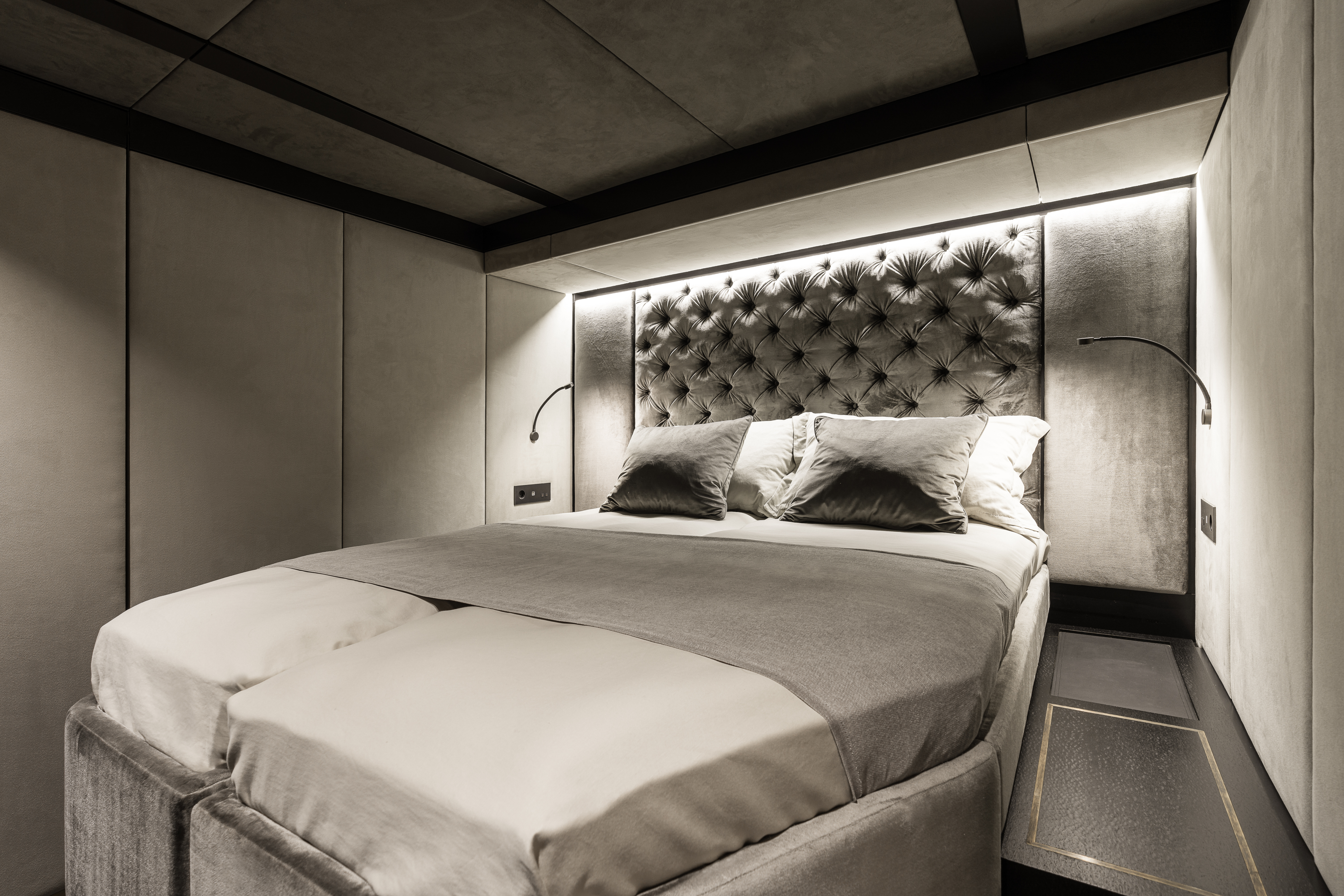 The starboard hull houses a vip cabin with a walk-in dressing and desk as well as a guest stateroom with a convertible twin bed.