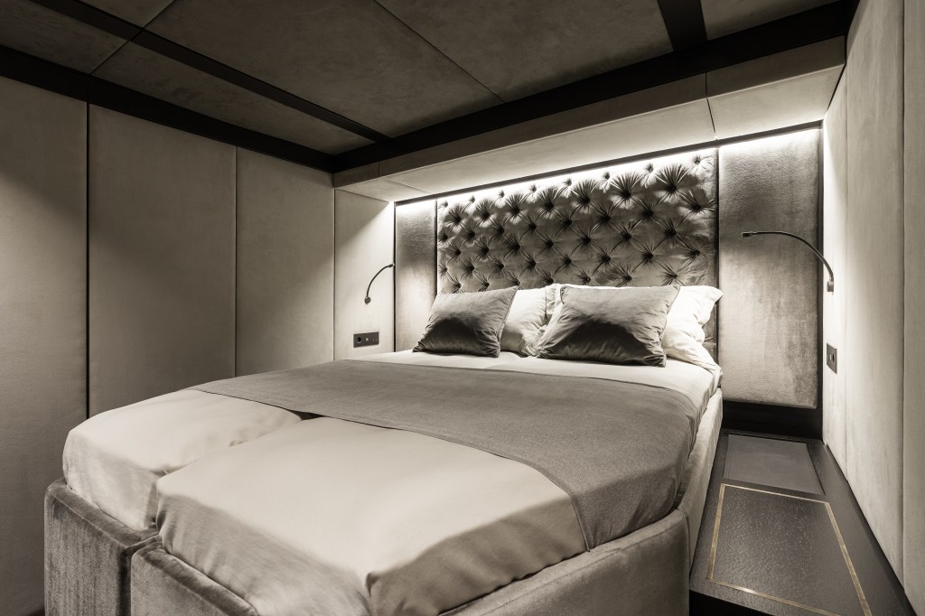 The catamaran’s layout provides generous accommodation for up to eight guests. Located in the portside hull along with one of the guest cabins, the yacht’s vast master suite was fitted with a king-size bed with a tufted backrest, a vanity and an elegant ensuite bathroom.