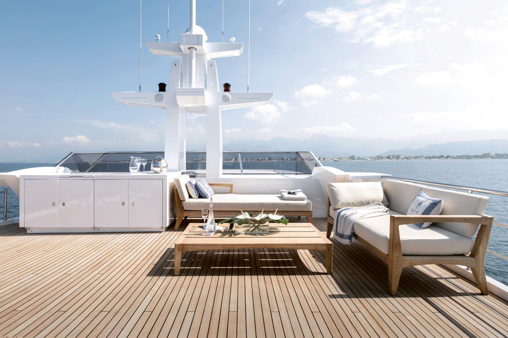 The yacht has a second lounge or beach club area in the bow (30 m2, excluding the side walkways) and is fitted with sofas, a sun lounging area and a hydromassage tub. The spacious deck area in front the tub is in fact a platform that can be raised using an electrohydraulic mechanism to gain access to the winches and fender racks beneath. The trapezoidal bow provides plenty of space and even more comfort throughout the area during both mooring operations and navigation.
