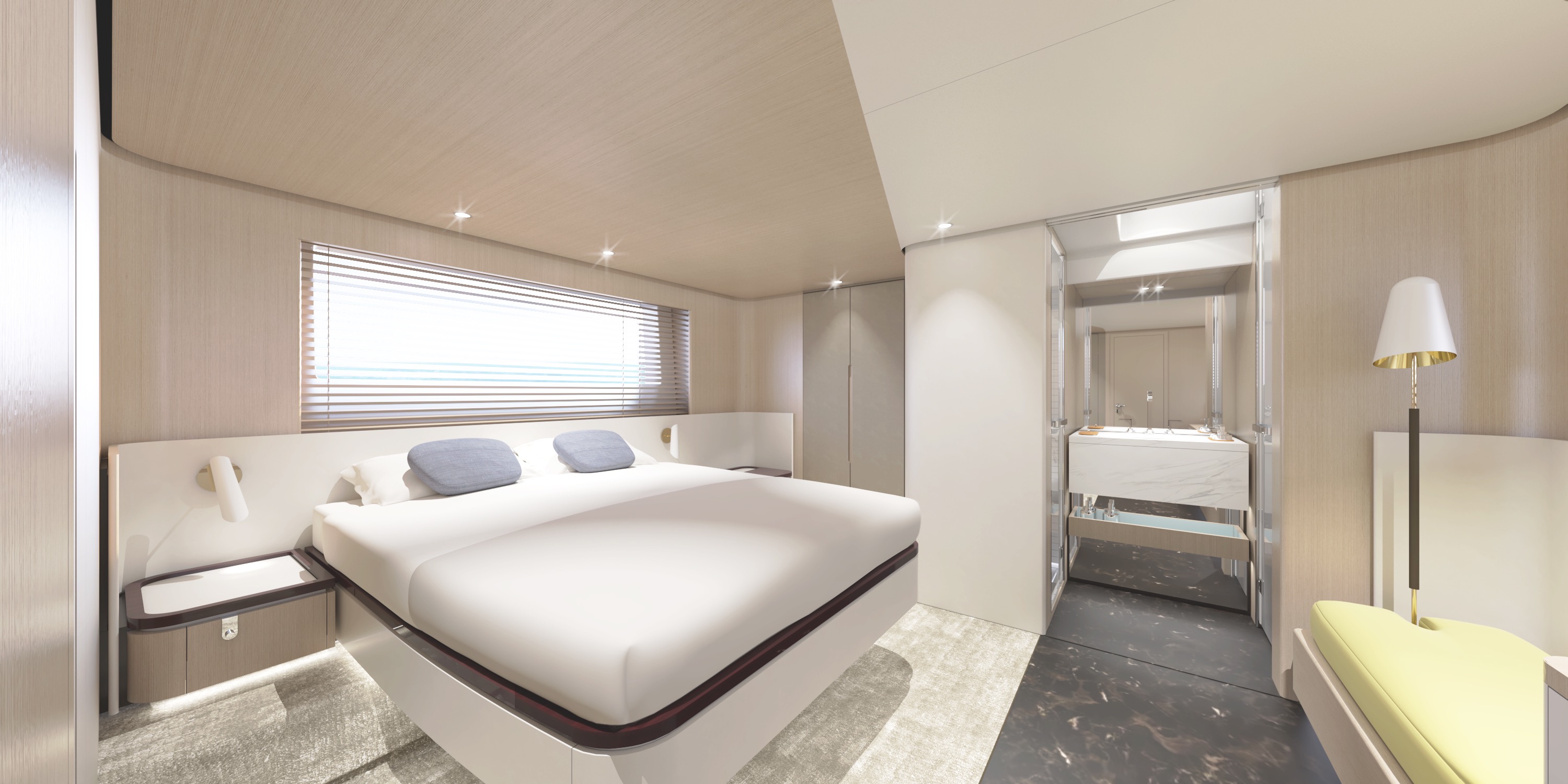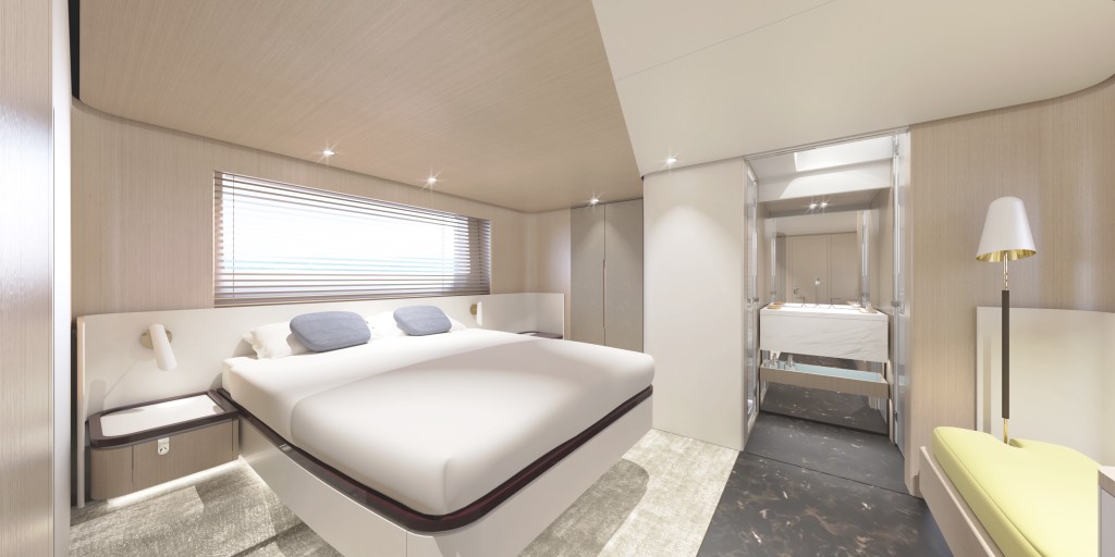 The stand-out feature in the 68’s interiors, lastly, is the refined owner’s suite, characterised by a natural and unaffected sense of luxury and an atmosphere of wellbeing that is close to the modern concept of wellness. The part of the bathroom with the sink is open-style in fact, in direct communication with the suite and reminiscent of the serenely relaxed atmosphere of a refined modern spa.