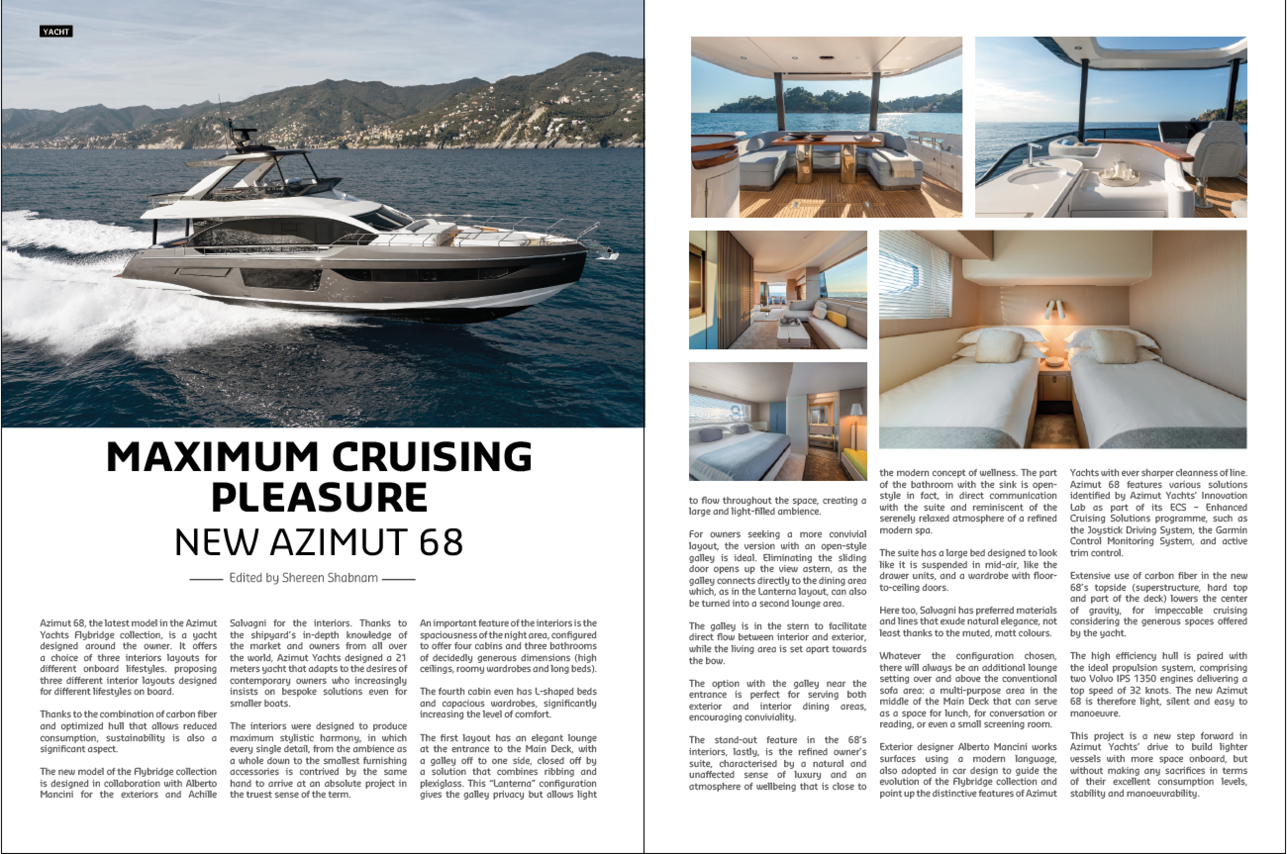 Azimut 68, the latest model in the Azimut Yachts Flybridge collection, is a yacht designed around the owner. It offers a choice of three interiors layouts for different onboard lifestyles. proposing three different interior layouts designed for different lifestyles on board. Thanks to the combination of carbon fiber and optimized hull that allows reduced consumption, sustainability is also a significant aspect.
