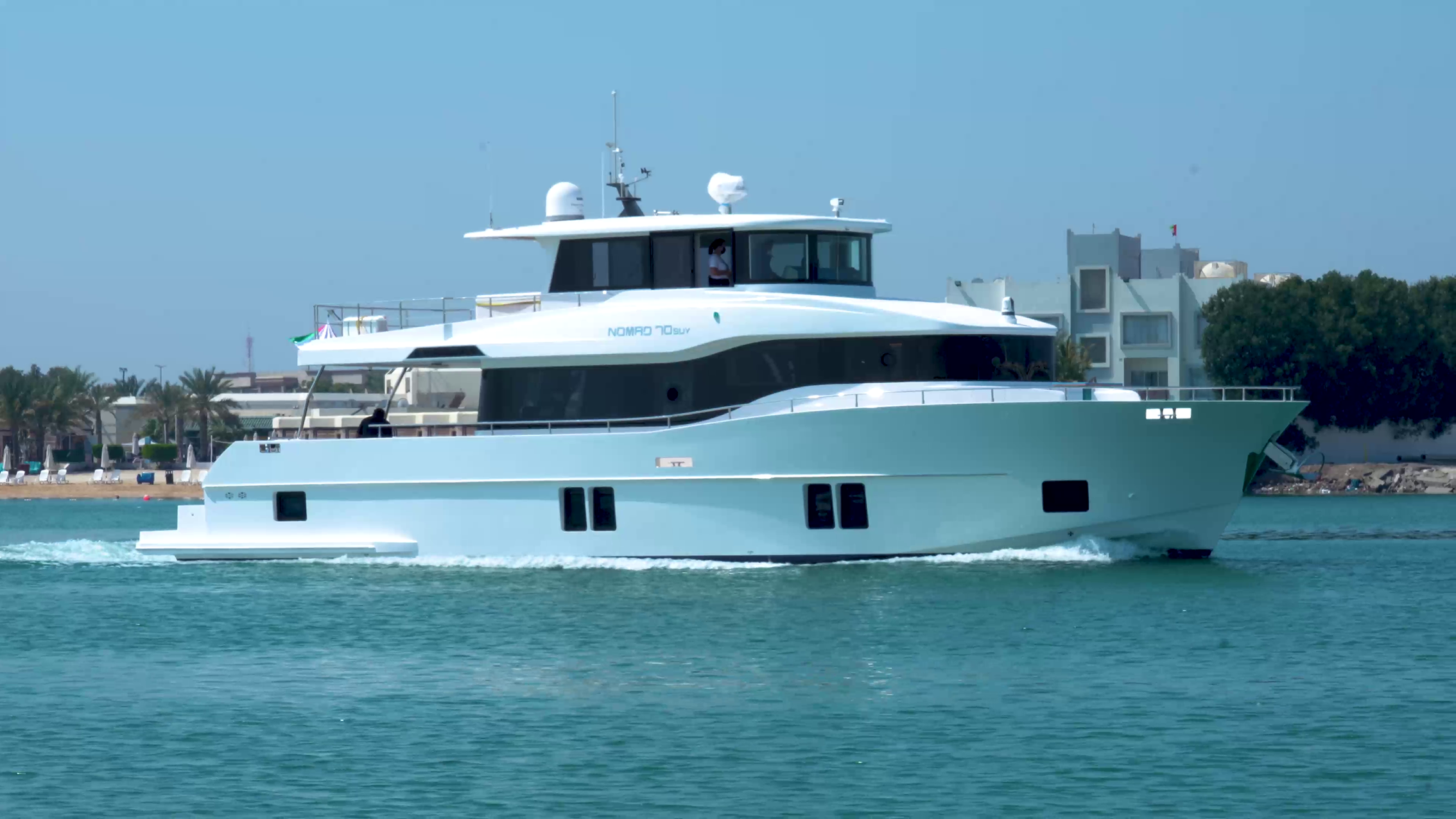 Nomad 70 is a show-stopper yacht that draws on the strengths, design elegance and performance of Gulf Craft’s Nomad 65 and 75 and will meet the requirements of a discerning clientele. The explorer yacht, built with fibre reinforced plastic, is 21.5 metres long (70’5”) and its lightweight material yields a draft of just 1.43m (4’7”). To host 10+2, the motor yacht has a displacement of 45 tons and hits top speed of 30 knots subject to the cleanliness of the hull and sea conditions. It is powered by a 1,200HP, 882kW, 2,300 RPM Twin MAN engine.