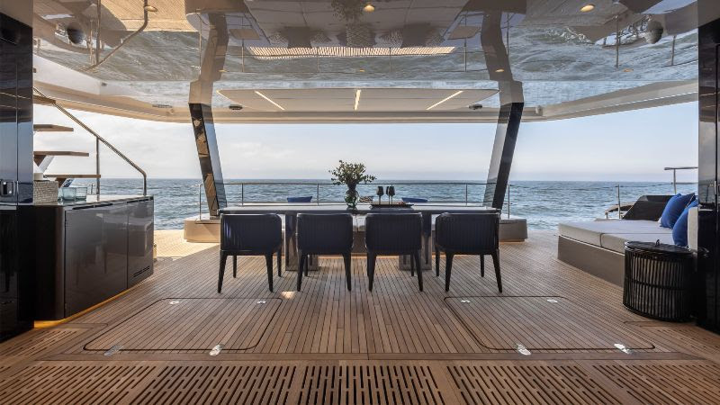 The full-beam aft cockpit welcomes guests by a large dining table for eight. The catamaran’s invisible aft garage conceals a 3-seater jest ski with a refueling station along with a collection of water toys. Engineered by Sunreef Yachts, the jet ski launching system is easy and fun to use.