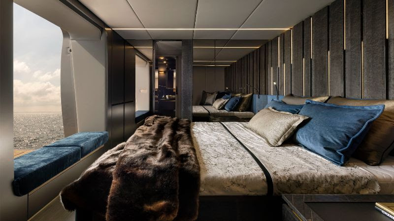 The interior décor combines dark tones and tasteful fabrics for a modern glam feel. Portside of the main deck, the galley offers everything your chef could ask for. The crew quarters are conveniently located just next to the galley, which gives both owners and crew a respectful level of privacy.